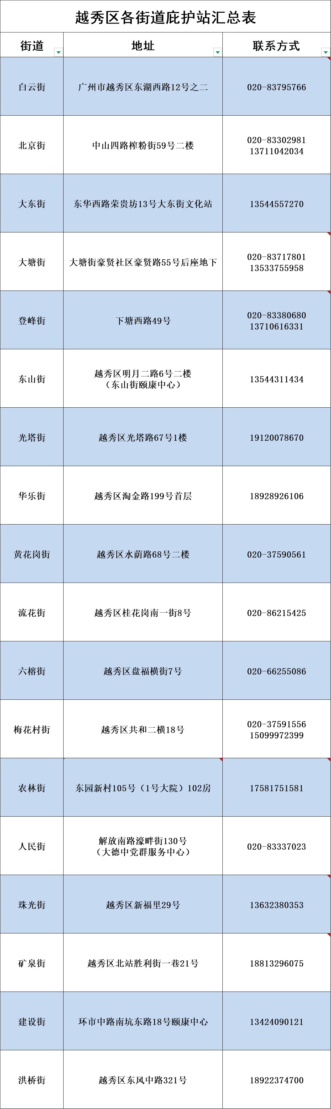 越秀区各街道的庇护站