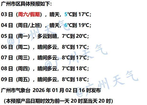 广州市气象台预计,1月2日-3日,受较强冷空气影响,广州多云到晴,最高气温下降至15℃左右。这次降温最低气温将出现在1月3日早晨:北部3-5℃(山区-2至1℃,局部有霜/冰冻),中部5-7℃,南部7-9℃;陆地阵风将加大至5-7级,港区和高地阵风7-9级。1月4日起,广州总体维持晴朗干燥天气,气温小幅波动。
