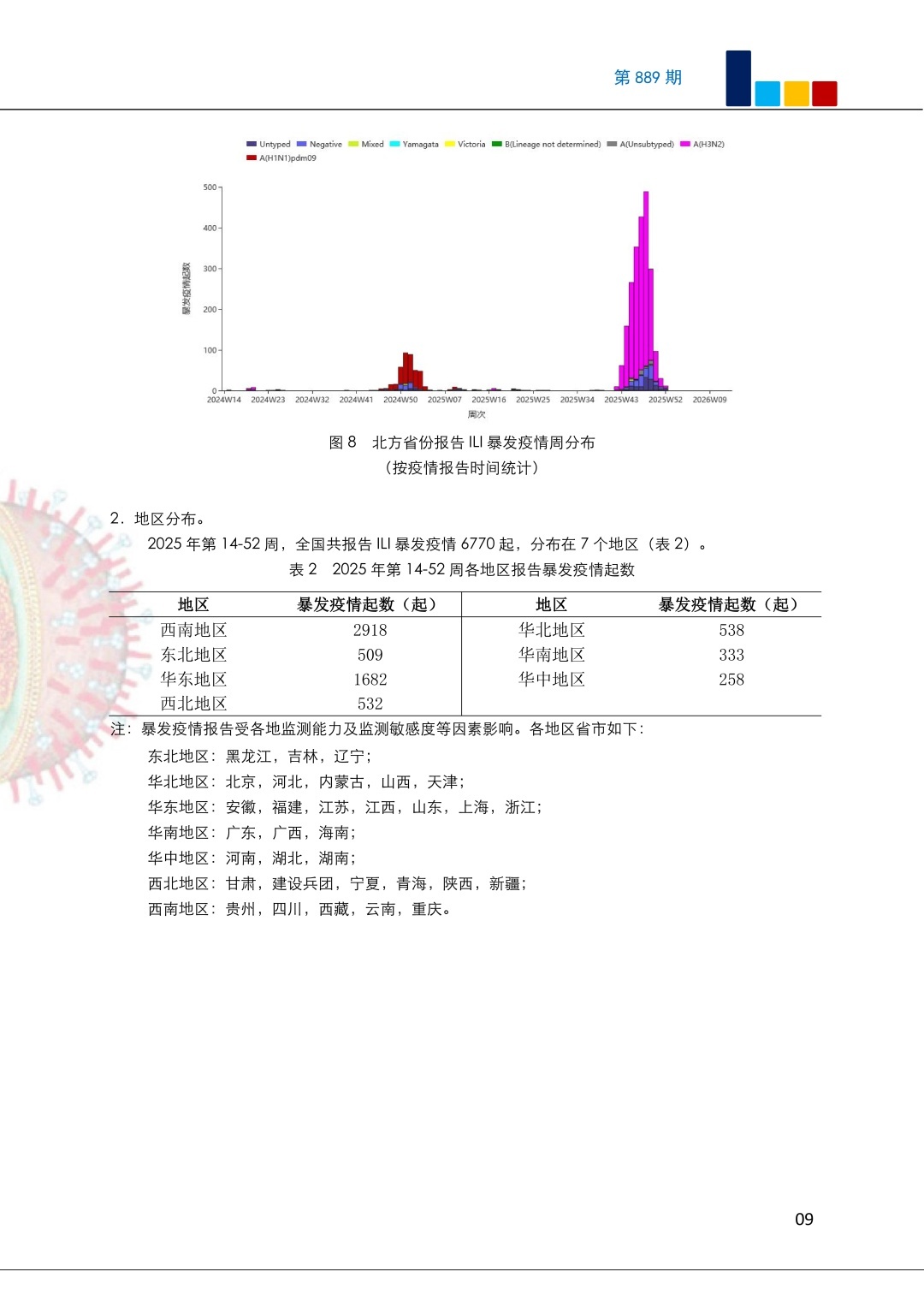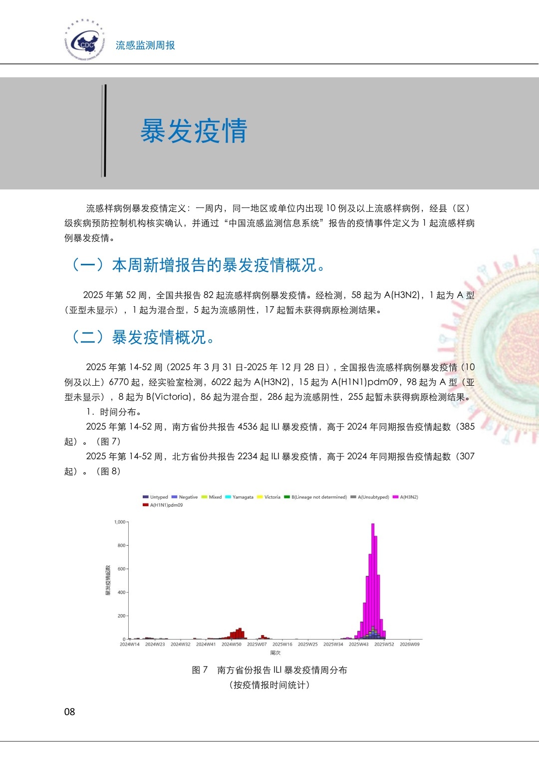 监测数据显示,本周南、北方省份流感病毒检测阳性率继续下降。全国共报告82起流感样病例暴发疫情。