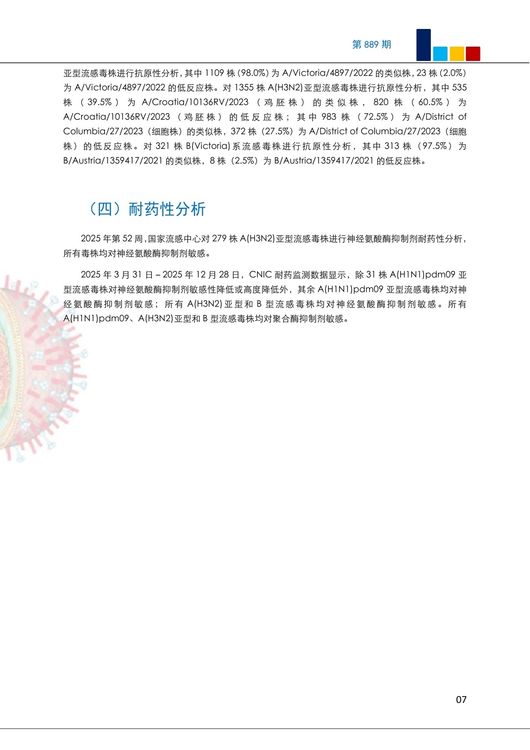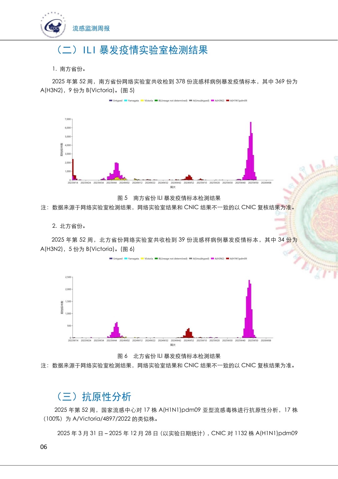 国家流感中心对2025年3月31日-2025年12月28日(以实验日期统计)期间收检的部分流感病毒毒株进行抗原性分析,结果显示:在A(H1N1)pdm09亚型流感病毒毒株中有98.0%(1109/1132)为A/Victoria/4897/2022的类似株;在A(H3N2)亚型流感病毒毒株中有39.5%(535/1355)为A/Croatia/10136RV/2023(鸡胚株)的类似株,72.5%(983/1355)为A/District of Columbia/27/2023(细胞株)的类似株;在B(Victoria)系流感病毒毒株中有97.5%(313/321)为B/Austria/1359417/2021的类似株。