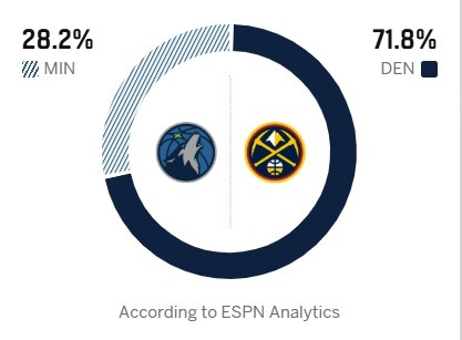 ESPN预测本场比赛胜率:掘金高达71.8%,森林狼28.2%。