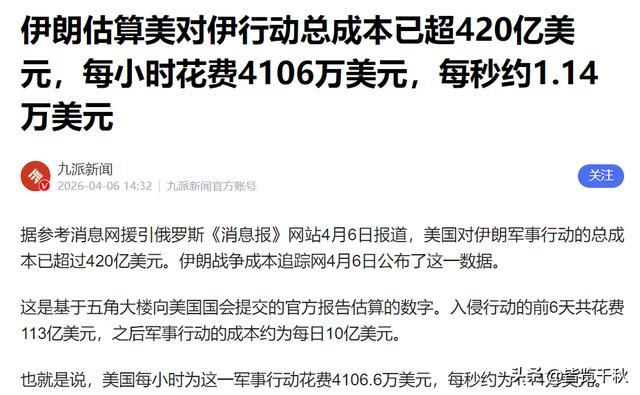 俄媒4月6日报道,美国对伊朗军事行动的总成本已超过420亿美元,钱只是表层,更深的是库存与产能。